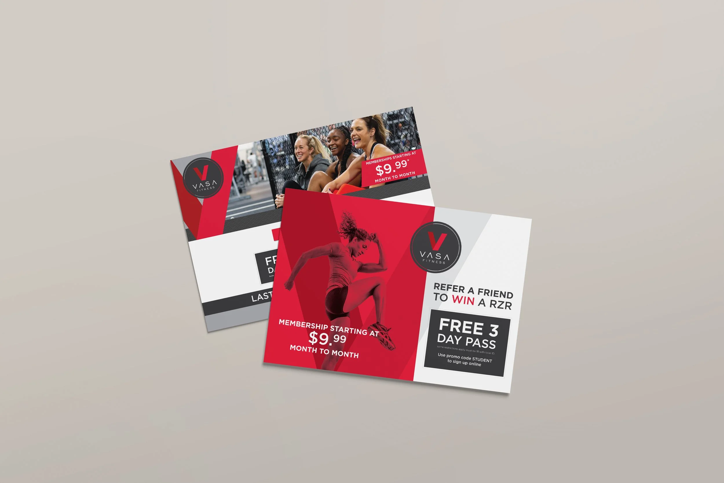 Custom postcard advertisements designed to increase gym enrollment and local brand awareness for VASA Fitness. These assets prioritize bold branding and clear promotional messaging to cut through the noise. From layout to final print specs, every element is designed to drive local foot traffic and online registrations.